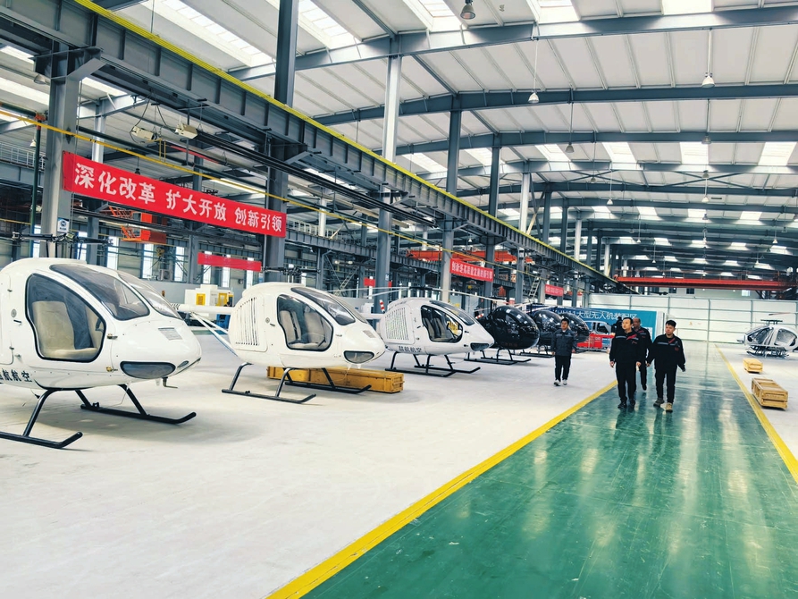 4月11日,山西喆航生產(chǎn)車間內(nèi),工作人員再次檢視準(zhǔn)備交付的ZH281A直升機。