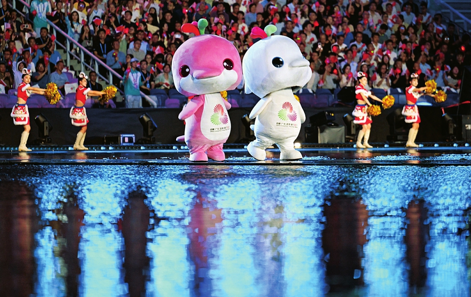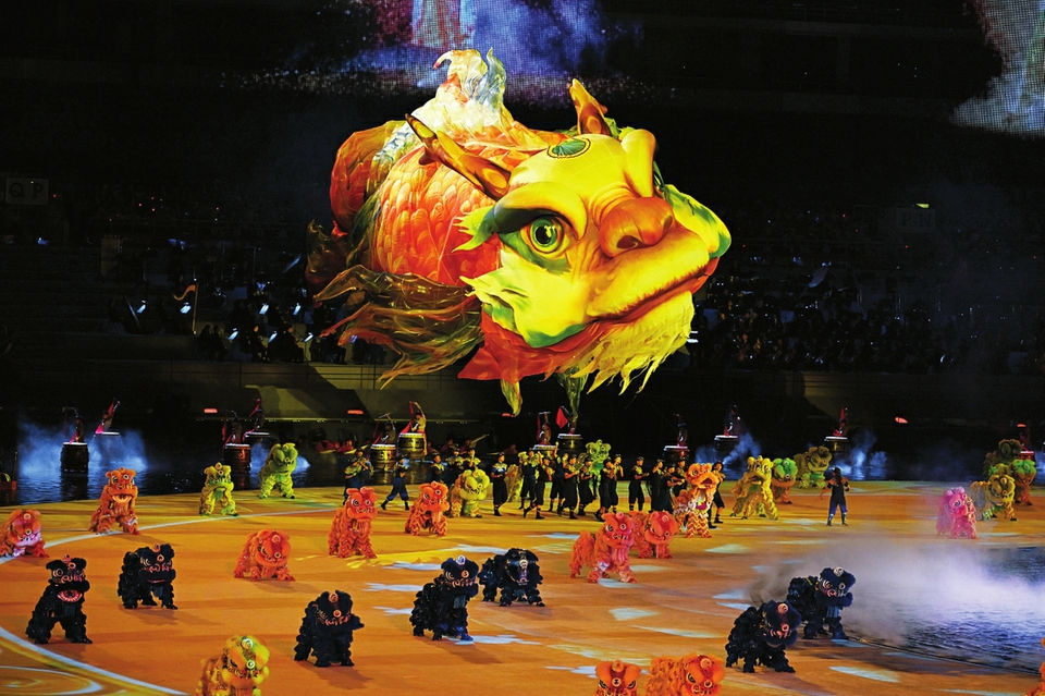 第十五屆全國運(yùn)動(dòng)會吉祥物“喜洋洋”和“樂融融”在開幕式現(xiàn)場表演。圖片均為開幕式表演現(xiàn)場。 本版圖片均來源新華社