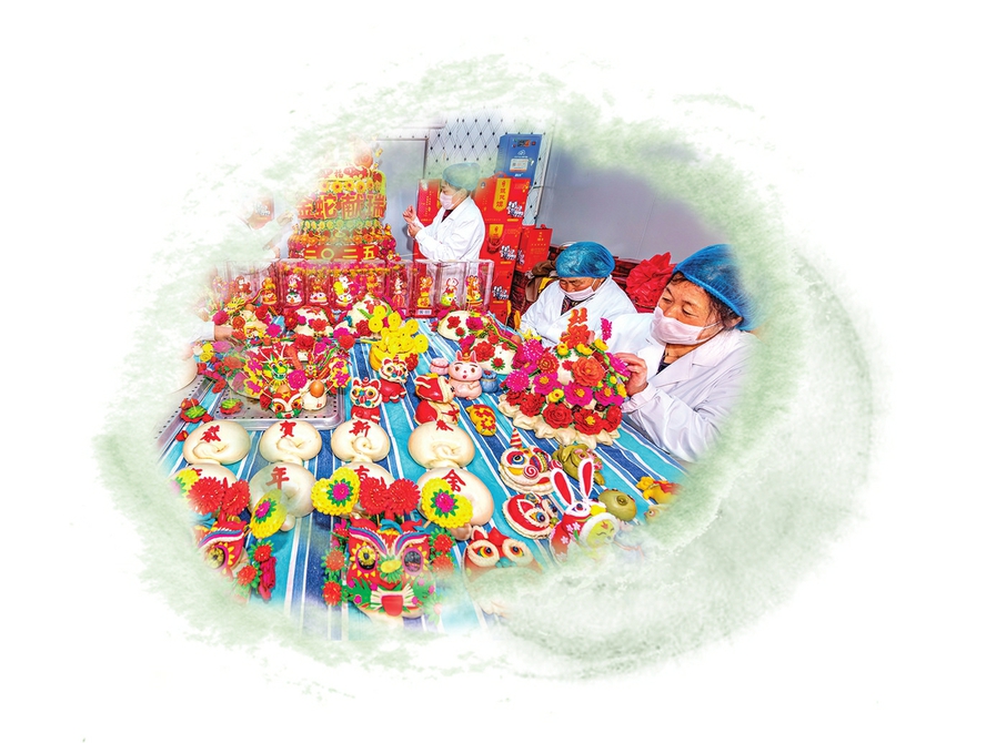 在萬(wàn)榮縣解云仙花饃店里,民間藝人正在捏制獨(dú)具晉南特色、栩栩如生的面塑花饃。薛俊攝