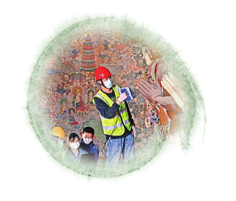 云岡石窟專業(yè)技術(shù)人員在開(kāi)展教學(xué)實(shí)踐,帶領(lǐng)學(xué)生進(jìn)行壁畫保護(hù)修復(fù)實(shí)操。云岡石窟研究院提供