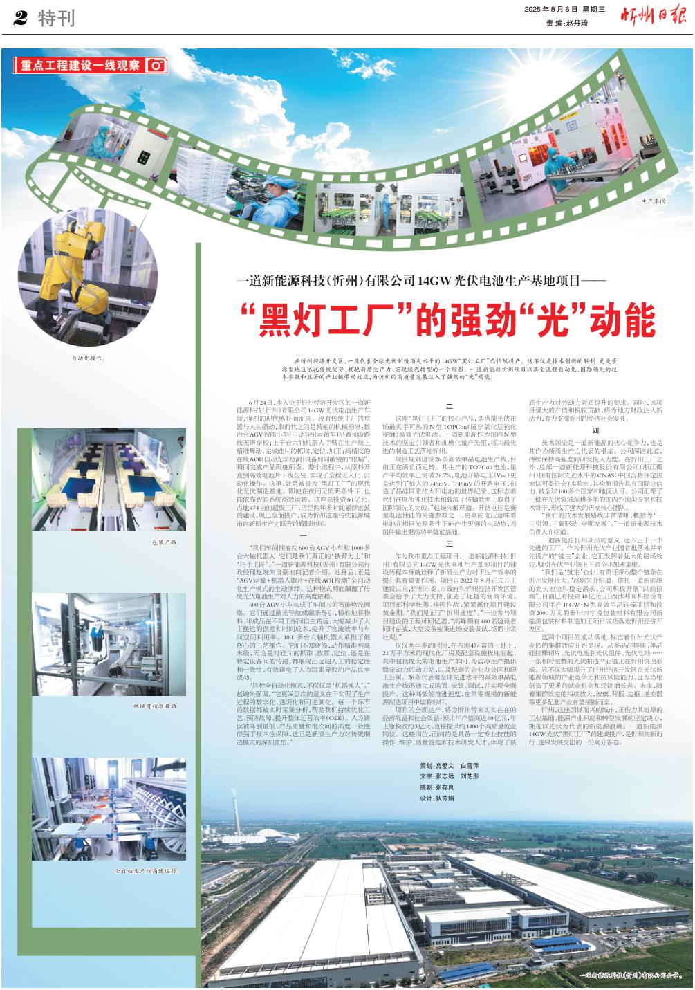 6月24日,步入位于忻州經(jīng)濟開發(fā)區(qū)的一道新能源科技(忻州)有限公司14GW光伏電池生產(chǎn)車間,強烈的現(xiàn)代感撲面而來。沒有傳統(tǒng)工廠的喧囂與人頭攢動,取而代之的是精密的機械韻律:數(shù)百臺AGV智能小車(自動導引運輸車)沿著預設(shè)路線無聲穿梭;上千臺六軸機器人手臂在生產(chǎn)線上精準舞動,完成硅片的抓取、定位、加工;高精度的在線AOI(自動光學檢測)設(shè)備如同敏銳的“眼睛”,瞬間完成產(chǎn)品瑕疵篩查。整個流程中,從原料開盒到高效電池片下線包裝,實現(xiàn)了全程無人化、自動化操作。這里,就是被譽為“黑燈工廠”的現(xiàn)代化光伏制造基地。即使在夜間無照明條件下,也能依靠智能系統(tǒng)高效運轉(zhuǎn)。這座總投資60億元、占地474畝的超級工廠,歷經(jīng)兩年多時間緊鑼密鼓的建設(shè),現(xiàn)已全面投產(chǎn),成為忻州這座傳統(tǒng)能源城市向新質(zhì)生產(chǎn)力躍升的耀眼地標。