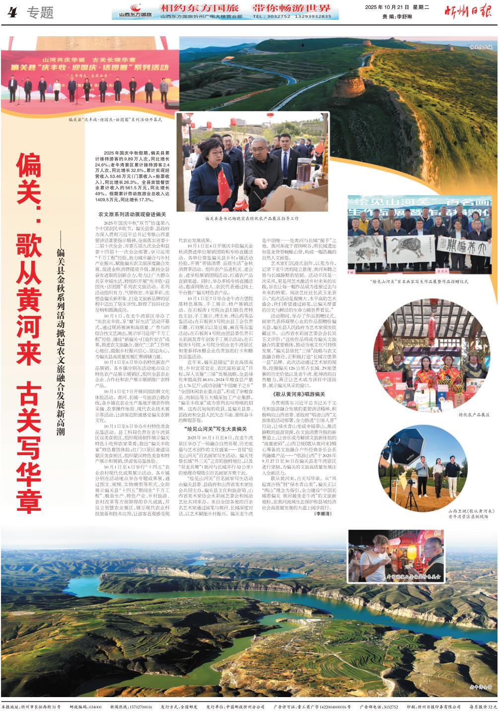 2025年國慶中秋假期,偏關(guān)縣累計接待游客約9.89萬人次,同比增長24.6%;老牛灣景區(qū)累計接待游客2.4萬人次,同比增長32.6%,累計實現(xiàn)經(jīng)營收入53.46萬元(門票收入+船票收入),同比增長26.3%。全縣賓館餐飲業(yè)累計收入約561.5萬元,同比增長49%。假期累計帶動旅游業(yè)總收入達1409.5萬元,同比增長17.3%。 農(nóng)文旅系列活動展現(xiàn)奮進偏關(guān) 2025年國慶中秋“雙節(jié)”恰逢第八個中國農(nóng)民豐收節(jié),偏關(guān)縣委、縣政府為深入貫徹習近平總書記考察山西重要講話重要指示精神,全面落實省委十二屆十次全會、市委五屆九次全會和縣委十四屆十一次全會部署,學習運用“千萬工程”經(jīng)驗,助力城鄉(xiāng)融合與鄉(xiāng)村產(chǎn)業(yè)振興,賦能偏關(guān)農(nóng)文旅深度融合發(fā)展,促進金秋消費提質(zhì)升級,激揚全縣奮發(fā)進取的創(chuàng)新合力,努力讓廣大群眾共享幸福生活,特組織開展“慶豐收·迎國慶·話團圓”系列農(nóng)文旅活動。系列活動組織有力、氣勢恢宏、豐富多彩,在塑造偏關(guān)新形象、打造文旅新品牌的征程中邁出了堅實步伐,取得了良好社會反響和圓滿成功。 10月1日,在老牛灣景區(qū)舉辦了“慶農(nóng)業(yè)豐收,享‘糜’好生活”活動開幕式,通過現(xiàn)場展演和高質(zhì)量、廣參與的綜合性文藝演出,展示學習運用“千萬工程”經(jīng)驗、建設(shè)“新偏關(guān)·打造忻安吉”成果,推進農(nóng)文旅融合,強化“三農(nóng)”工作核心地位,提振鄉(xiāng)村振興信心、堅定決心,為偏關(guān)縣高質(zhì)量發(fā)展匯聚磅礴力量。 10月1日至6日舉辦名特優(yōu)新農(nóng)產(chǎn)品展銷。各鄉(xiāng)鎮(zhèn)分別在活動地點設(shè)立特色農(nóng)產(chǎn)品展示展銷區(qū),組織全縣農(nóng)業(yè)企業(yè)、合作社和農(nóng)戶展示展銷推廣農(nóng)特產(chǎn)品。 10月1日至7日開展田園農(nóng)耕文化體驗活動。黃河、長城一號旅游公路沿線,各鄉(xiāng)鎮(zhèn)在農(nóng)業(yè)生產(chǎn)基地開展農(nóng)作物采摘、農(nóng)事操作體驗、現(xiàn)代農(nóng)業(yè)技術(shù)展示等活動,讓游客近距離感受偏關(guān)農(nóng)耕文化。 10月1日至6日舉辦鄉(xiāng)村特色美食品鑒活動??h工科局負責在老牛灣景區(qū)設(shè)美食街區(qū),組織現(xiàn)場制作展示偏關(guān)特色小吃和農(nóng)家菜肴,推出“偏關(guān)豐收宴”特色餐飲體驗;紅門口景區(qū)廊道設(shè)蒙漢美食街區(qū),組織蒙漢特色美食和特產(chǎn)展示和展銷,供游客品鑒體驗。 10月1日至6日舉行“十四五”農(nóng)業(yè)農(nóng)村現(xiàn)代化成果展示活動。各鄉(xiāng)鎮(zhèn)分別在活動地點舉辦專題成果展,通過圖文、視頻、實物模型等形式,全面展示偏關(guān)縣“十四五”期間在“千萬工程”、糧食生產(chǎn)、特色產(chǎn)業(yè)、鄉(xiāng)村旅游、農(nóng)村改革等方面取得的非凡成就,并設(shè)立智慧農(nóng)業(yè)展區(qū),展示現(xiàn)代農(nóng)業(yè)科技裝備和技術(shù)應(yīng)用,讓游客直觀感受現(xiàn)代農(nóng)業(yè)發(fā)展成果。 10月1日至6日開展慶豐收偏關(guān)金秋消費進單位展銷團購和專場直播活動。各單位借鑒偏關(guān)縣鄉(xiāng)村e鎮(zhèn)活動經(jīng)驗,開展“晉情消費品質(zhì)生活”金秋消費季活動。組織農(nóng)產(chǎn)品進機關(guān)、進企業(yè)、進學校展銷團購活動,打通農(nóng)產(chǎn)品直銷渠道。同時,舉辦多場專場直播活動,邀請網(wǎng)絡(luò)達人、農(nóng)民代表通過線上平臺推廣偏關(guān)特色農(nóng)產(chǎn)品。 10月1日至7日舉辦老牛灣古堡院落特色展陳、手工展示、特產(chǎn)展銷活動。在石板街1號院由縣婦聯(lián)負責特色文創(chuàng)、手工展示、烤玉米、烤山藥等品鑒活動;在石板街3號院由縣工會負責石雕、石刻展示以及豆腐、麻花等品鑒活動;在石板街4號院由團縣委負責石頭彩畫及青年創(chuàng)客手工展示活動;在石板街5號院、6號院分別由老牛灣景區(qū)和榮泰祥冰醋企業(yè)負責旅拍打卡和醋飲品鑒活動。 近年來,偏關(guān)縣錨定“農(nóng)業(yè)高質(zhì)高效、鄉(xiāng)村宜居宜業(yè)、農(nóng)民富裕富足”目標,深入實施“三綠”發(fā)展戰(zhàn)略,全縣綠化率提高到48.6%,2024年糧食總產(chǎn)量達1.76億斤;成功創(chuàng)建“中國糜子之鄉(xiāng)”“全國休閑農(nóng)業(yè)重點縣”,形成了雜糧食品、肉制品等五大精深加工產(chǎn)業(yè)集群,“偏關(guān)豐收宴”成為晉西北叫得響的招牌。這些沉甸甸的收獲,是偏關(guān)縣委、縣政府和全縣人民矢志不渝、接續(xù)奮斗的輝煌答卷。 “繪見山河關(guān)”寫生大美偏關(guān) 2025年10月1日至8日,在老牛灣景區(qū)舉辦了一場融合自然奇觀、歷史底蘊與藝術(shù)創(chuàng)作的文化盛宴——首屆“繪見山河關(guān)”百名畫家寫生活動。偏關(guān)憑借長城“外三關(guān)”之首的獨特地位,以及“雙龍共舞”(黃河與長城并行32公里)的地理奇觀吸引百名畫家齊聚于此。 “繪見山河關(guān)”百名畫家寫生活動由偏關(guān)縣委、縣政府和山西省美術(shù)家協(xié)會共同主辦,偏關(guān)縣文化和旅游局、山西省美術(shù)家協(xié)會水彩畫藝委會和閑涂藝社共同承辦。來自全國各地的百余名藝術(shù)家通過畫筆與黃河、長城深度對話,以藝術(shù)