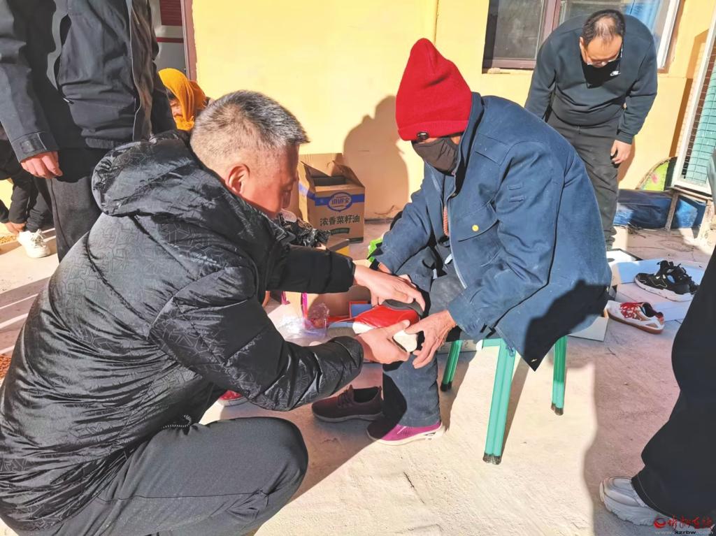 工作人員幫助老人穿棉鞋。