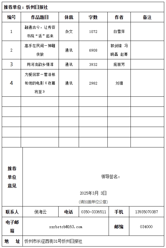 經(jīng)忻州日報社編委會研究決定,以下作品擬推薦申評第34屆山西新聞獎,現(xiàn)予以公示。有反對意見者,請將反對意見書面報至統(tǒng)計考核部。