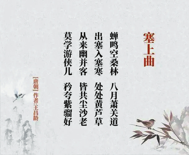 《塞上曲》唐(王昌齡):“蟬鳴空桑林,八月蕭關(guān)道。出塞入塞寒,處處黃蘆草。從來幽并客,皆共塵沙老。莫學(xué)游俠兒,矜夸紫騮好?!痹娭械娜?、塞下,說穿了就是關(guān)外和關(guān)內(nèi)。但,其實景象沒什么特別,黃云、風(fēng)沙、駿馬、朔雪、美酒、桑林、關(guān)道、蘆草、沙場,也似乎只有這些才能更符合邊塞詩人的審美。而“雁門關(guān)”成了李頎、王昌齡這對好友的共同命題。