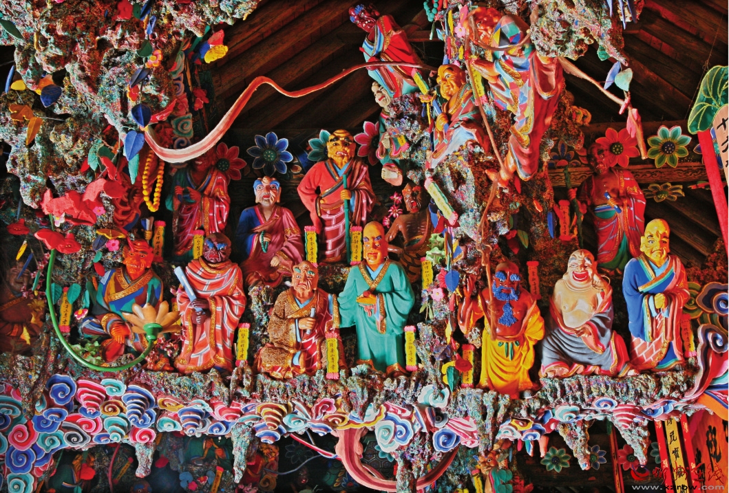 金閣寺現(xiàn)存的寺廟建筑及塑像,均在明、清、民國復(fù)修。寺廟坐北向南,占地面積2.l萬平方米,呈正方形。穿牌坊,登臺(tái)階,進(jìn)天王殿,殿檐下掛著題有“金閣寺”的大匾。在第一處大院中間,矗立一座大閣,內(nèi)供高17.7米的千手(實(shí)為48臂)觀音銅像,這是五臺(tái)山最高最大的圣像。像原本為銅鑄,造于明嘉靖四年(1525年),后人重修該寺時(shí),為使觀音更加中性化,便在銅像外面貼泥、金妝,從肩膀兩旁伸出許多胳膊,手執(zhí)各種兵器,加成了48臂,顯得異常威武,號千手觀音。殿閣內(nèi),左右后柱兩個(gè)1米高的石柱礎(chǔ),為圓形中間束腰上下卷蓮瓣形,是唐代遺物。