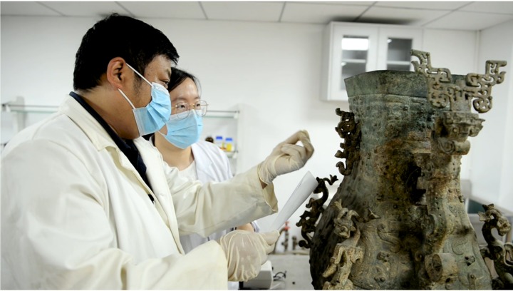 此外,為了堅持“最小干預(yù)”原則,保證文物真實性,此次修復(fù)并沒有對蓮鶴方壺進行統(tǒng)一著色?!拔覀冎厍謇砹擞泻︿P,而記錄著文物信息的無害銹得到原汁原味保留,紅斑處留紅,綠銹處存綠,保留文物的歷史信息。”杜安說。