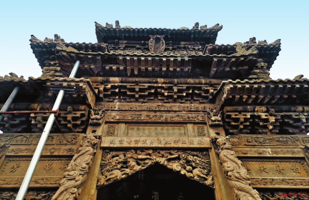 朱氏牌樓 主坊位于原平市大牛店鎮(zhèn)陽(yáng)武村,據(jù)記載,始建于清咸豐五年(公元1855年),坐東朝西,四柱三樓,重檐歇山頂,通高10.54米,通面寬15米,建于高0.94米的束腰須彌座上,束腰部雕有各種人物故事圖,正面雕有四個(gè)力士。額枋下四柱為方形霸王柱,前后有戧柱支撐。戧柱上有螭首纏繞。明樓略寬,兩次樓稍窄。明樓雀替上鏤雕有二龍戲珠圖,上置額枋及樓匾,分別署“咸豐五年九月男武訪疇謹(jǐn)建”“旌表資政大夫庠生武烈之妻朱氏節(jié)孝坊”。兩次樓雀替上鏤雕丹鳳朝陽(yáng),額枋上分別署“柏舟矢志”“竹帛流芳”,上下枋均雕有二十四孝圖、人物故事及花鳥(niǎo)走獸等圖案。下層檐仿木構(gòu)石雕斗拱,五踩重翹,上層檐仿木構(gòu)石雕斗拱,三踩單翹。坊前設(shè)有石雕、旗桿各一對(duì)。配坊坐北朝南,四柱三門,單檐歇山頂。牌樓石刻神獸、人物、楹聯(lián)。1982年維修。1965年公布為省級(jí)文物保護(hù)單位。2019年入選全國(guó)第八批國(guó)家級(jí)保護(hù)單位。 (責(zé)任編輯:盧相?。?/span> |