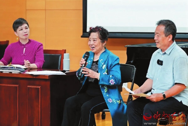 國(guó)家級(jí)二人臺(tái)非遺傳承人許月英有著五十多年從事民歌演唱、二人臺(tái)表演的經(jīng)歷。當(dāng)天的課堂上,許月英教唱了河曲民歌《走西口》的兩個(gè)片段,并范唱了《掛紅燈》《人家都在你不在》。