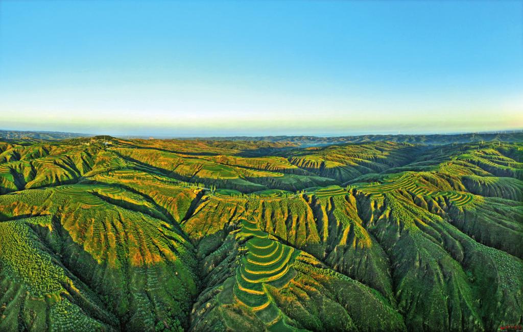 站在趙家溝的山頂看日出是一件賞心悅目的事情。8月4日早晨,當朝陽從東方的山巒噴薄而出,在萬丈霞光的映照下,莽原織繡,梁峁吐翠,田疇如畫,生機勃發(fā)。居高臨下看到的夏日晉北高原美景妙不可言,使人陶醉。
