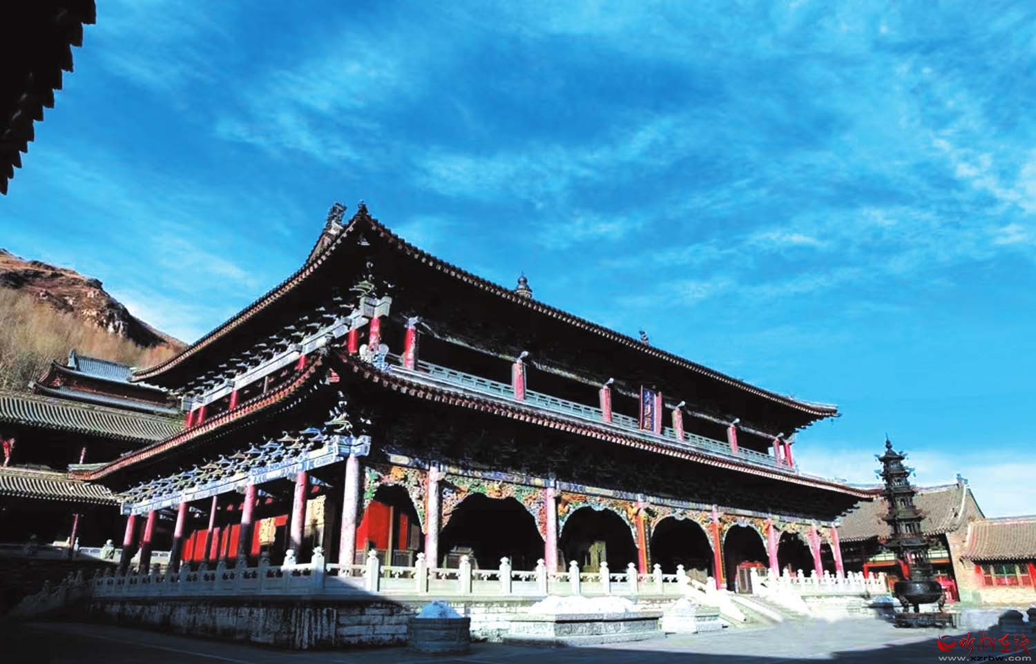 經(jīng)過(guò)懸掛著“金閣浮空”匾額的木牌坊,沿著108級(jí)漢白玉石臺(tái)階拾級(jí)而上,山門(mén)處沉靜肅穆。放慢腳步,深深呼吸,感受空氣的清新與純凈,感受獨(dú)有的靜謐與祥和。走進(jìn)寺內(nèi),仿佛穿越時(shí)空,抵達(dá)一個(gè)與世隔絕的佛國(guó)世界。
