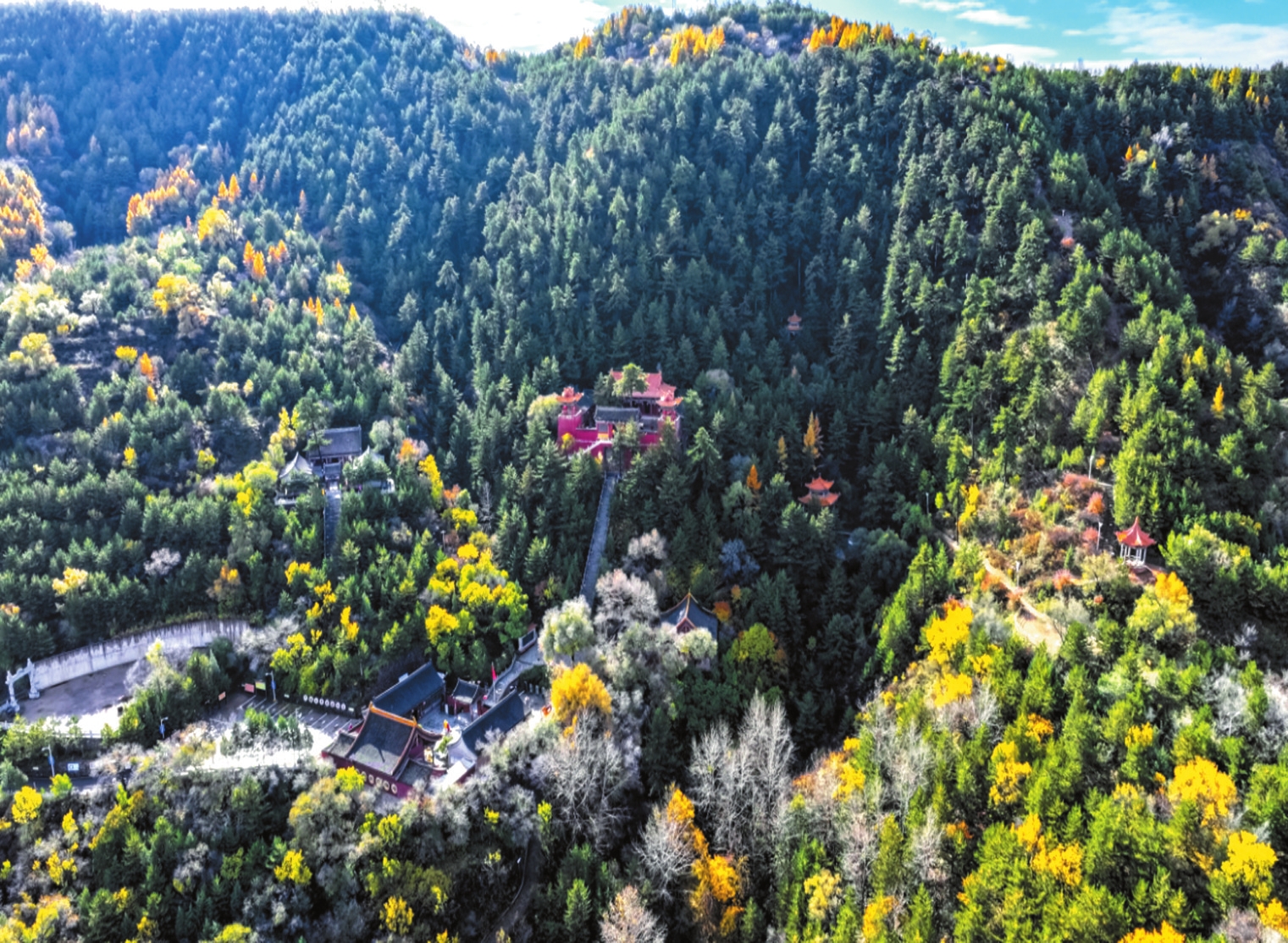 山林間宏大的廟宇建筑群始建于北魏時(shí)期,憑借清幽秀麗的自然風(fēng)光和深厚的文化底蘊(yùn),吸引了眾多高僧來(lái)此傳經(jīng)布道。隨著佛教文化的發(fā)展,與之相關(guān)的建筑藝術(shù)、雕塑藝術(shù)、壁畫藝術(shù)歷代都有發(fā)展,可惜大部分毀于戰(zhàn)火。1992年開始重建,集儒釋道于一體的廟宇群規(guī)模宏大。