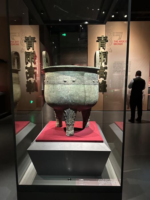 據(jù)首都博物館提供的資料顯示,該展品為商代青銅器,高約86cm,口徑61cm。鼎體呈直耳、深腹、柱足中空造型,胎壁輕薄,口沿下與足部裝飾單層獸面紋,足部設(shè)扉棱。