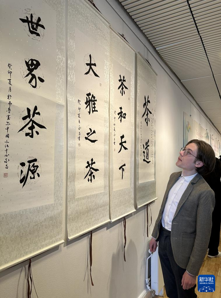 5月7日,在瑞典首都斯德哥爾摩的中國(guó)文化中心,參觀(guān)者觀(guān)看書(shū)法展示。