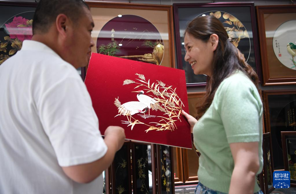 這個傳習基地,源自于“80后”谷穗和丈夫葛磊創(chuàng)辦的金穗子蘆葦工藝有限公司。谷穗的左臂輕微殘疾。夫妻倆祖輩都是蘆葦畫手藝人,因此結緣后致力于非遺蘆葦畫的傳習、生產、研發(fā)和銷售。他們就地取材,以蘆葦的葉、稈、花穗為原料,經過割、曬、晾、碾、貼等30多道工序精心制作成淮陽蘆葦畫。他們的作品經常參展并多次獲獎。2021年,淮陽蘆葦畫被評選為河南省非物質文化遺產。