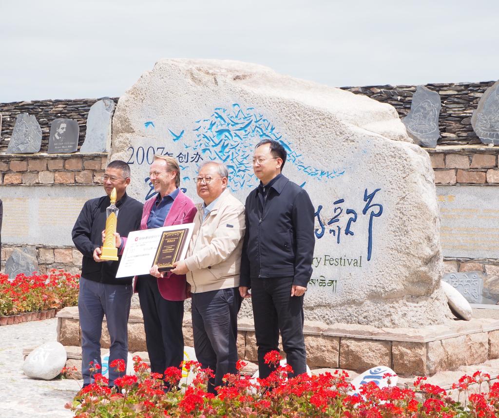 6月29日,吉狄馬加(右二)為澳大利亞詩(shī)人馬克·特雷尼克(左二)頒獎(jiǎng)。新華社記者 白瑪央措 攝
