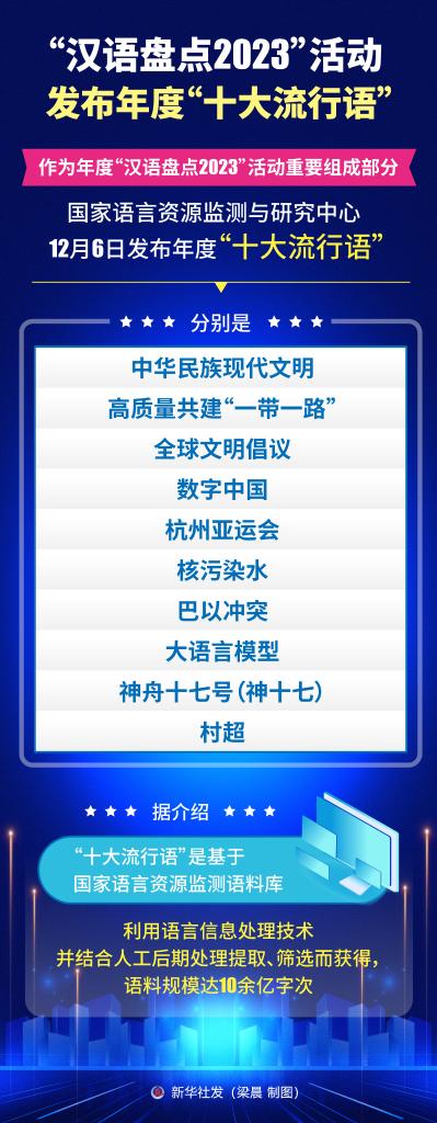 新華社北京12月6日電(記者史競男)作為年度“漢語盤點2023”活動重要組成部分,國家語言資源監(jiān)測與研究中心12月6日發(fā)布年度“十大流行語”,分別是:中華民族現(xiàn)代文明、高質(zhì)量共建“一帶一路”、全球文明倡議、數(shù)字中國、杭州亞運(yùn)會、核污染水、巴以沖突、大語言模型、神舟十七號(神十七)、村超。