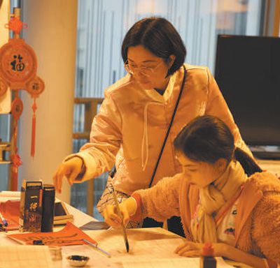 11歲的拜德細(xì)心地勾勒著龍的輪廓。他說:“我知道十二生肖,龍?jiān)谥袊幕锎碇α亢秃眠\(yùn)?!闭趯W(xué)寫“福”字的愛麗說:“我爺爺和爸爸都去過中國,說那里風(fēng)景很美,我長大也要去中國看看?!?/p>