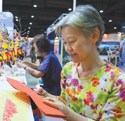 1月25日,在泰國國際旅游展上,參觀者體驗(yàn)中國剪紙。本報記者 白元琪攝