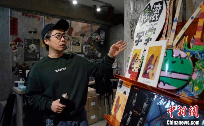 “戰(zhàn)馬時代”創(chuàng)始人、資深樂評人劉釗正在展示為維吾爾族歌唱家塞努拜爾制作的演出周邊紀念品。景詩雁 攝