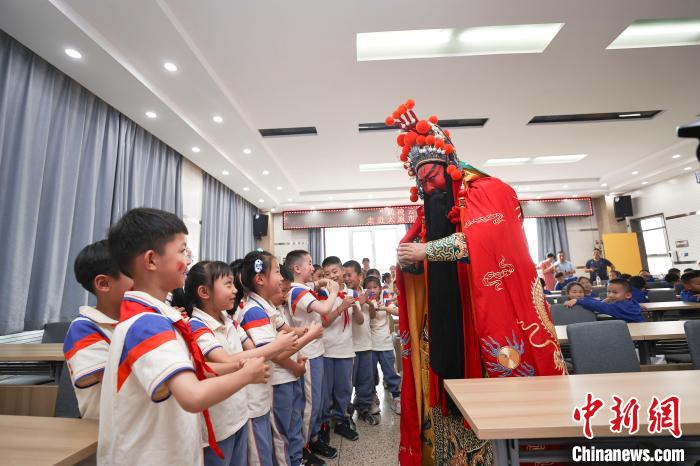 2023年6月26日,山西太原,小學(xué)生們與戲曲人物關(guān)公互動(dòng)。當(dāng)日,山西省武凌云晉劇名家工作室的藝術(shù)家們走進(jìn)太原新建路小學(xué)校,將傳統(tǒng)戲曲引進(jìn)課堂,讓學(xué)生們感受戲曲的魅力。 中新社記者 張?jiān)?攝