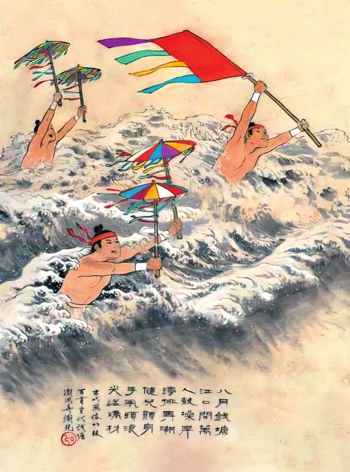 能在大江大河中搏擊風(fēng)浪的游泳好手,被人們尊稱(chēng)為“弄潮兒”。唐人李益曾作閨怨詩(shī)《江南曲》:“嫁得瞿塘賈,朝朝誤妾期。早知潮有信,嫁與弄潮兒?!蹦纤五X(qián)塘江弄潮是一大盛事,“浙江之潮,天下之偉觀也”。在“大聲如雷霆,震撼激射,吞天沃日,勢(shì)極雄豪”的潮水中,數(shù)百名弄潮兒“皆披發(fā)文身,手持十幅大彩旗,爭(zhēng)先鼓勇,溯迎而上,出沒(méi)于鯨波萬(wàn)仞中,騰身百變,而旗尾略不沾濕,以此夸能”。辛棄疾夸他們“不怕蛟龍怒。風(fēng)波平步??醇t旆驚飛,跳魚(yú)直上,蹙踏浪花舞”,潘閬更是贊嘆“弄潮兒向濤頭立,手把紅旗旗不濕”。