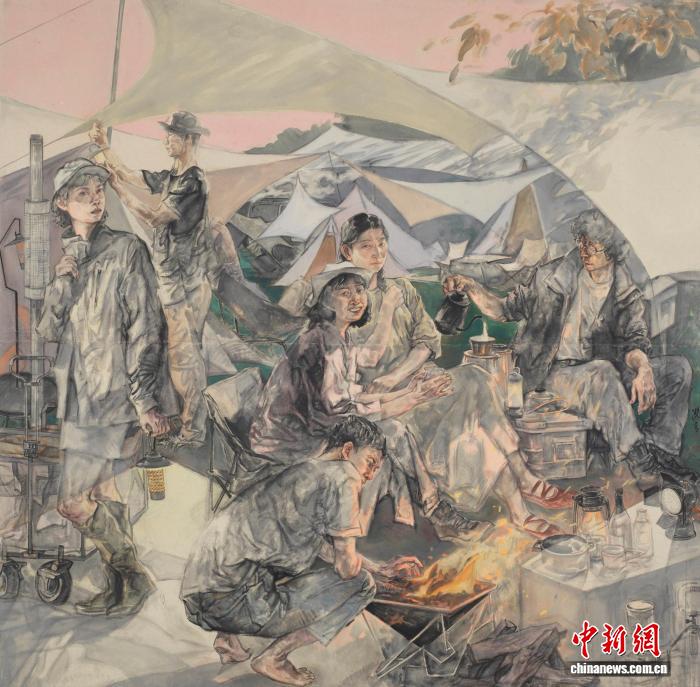 以畫家藺潔青的中國畫《清風(fēng)徐來》為例,其是浙江省第十五屆美術(shù)作品展金獎作品,以傳統(tǒng)人物畫技法表現(xiàn)當(dāng)代青年郊野露營場景,通過描繪清風(fēng)拂過林間被永恒定格的瞬間,傳遞都市人向往自然、追求心靈自由的當(dāng)代精神,展現(xiàn)出中國傳統(tǒng)繪畫語言在表現(xiàn)現(xiàn)實(shí)題材上的蓬勃生命力。