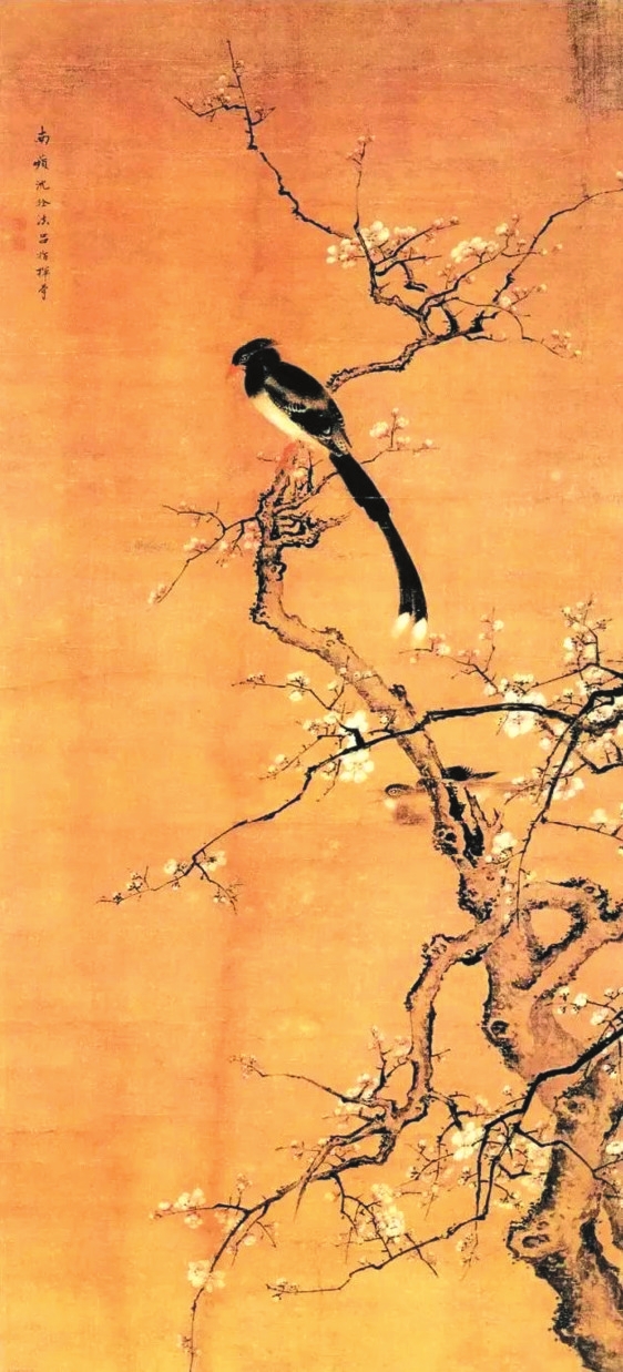 宋代畫家筆下的梅花大都與禽鳥有所關(guān)聯(lián),這主要得益于花鳥畫在此時的繁盛之勢。宋徽宗趙佶的《臘梅山禽圖》就把梅花與白頭翁聯(lián)系起來,描繪了在乍暖還寒的季節(jié)里,兩只相伴而生的白頭翁立于臘梅枝頭的場景,給觀者帶來復(fù)蘇之感。作品左下角題詩“山禽矜逸態(tài),梅粉弄輕柔。已有丹青約,千秋指白頭”,表達(dá)了愛情之思。因為白頭翁在傳統(tǒng)文化中象征吉祥與幸福,是對白頭偕老的隱喻,當(dāng)它與梅花結(jié)合起來時,便會強化人們對美好愛情的聯(lián)想。