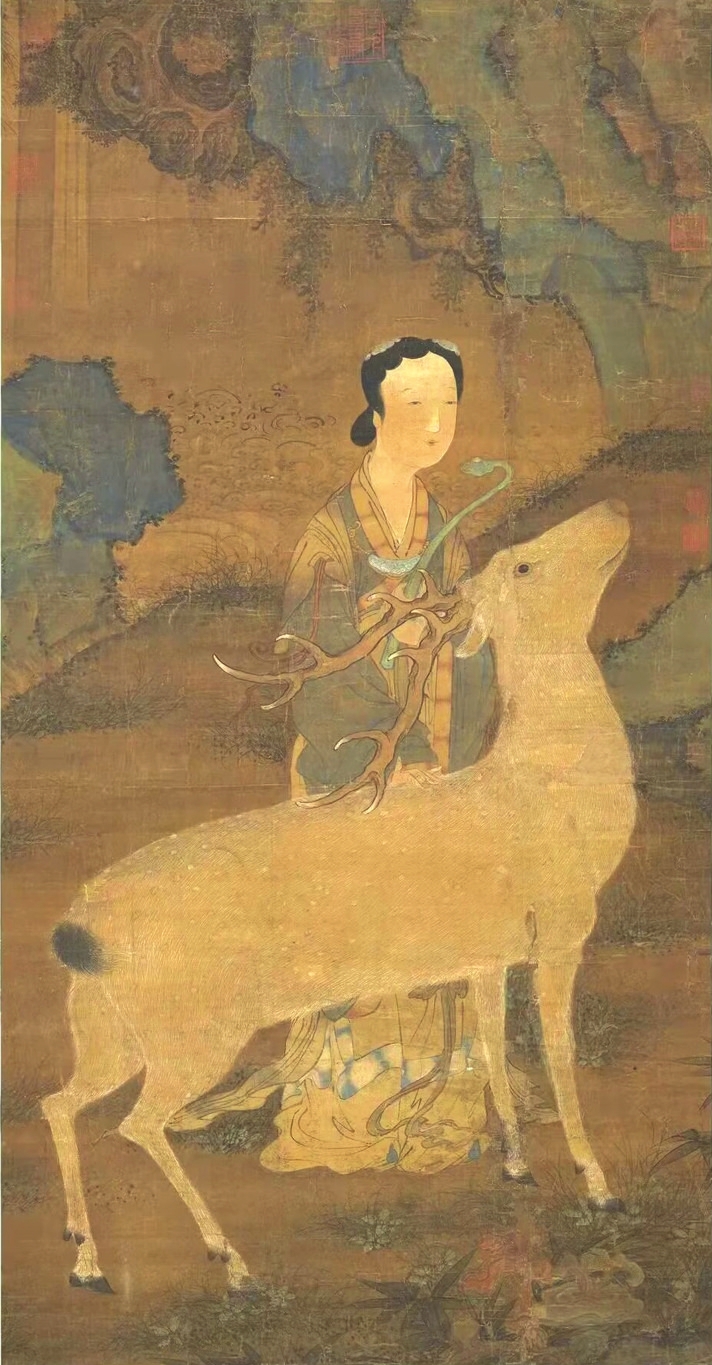 在傳統(tǒng)文化中,鹿是一種有神力的動(dòng)物,神話傳說中鹿往往是神仙的坐騎。李白一生尋仙問道,其《夢(mèng)游天姥吟留別》中有“且放白鹿青崖間,須行即騎訪名山”之名句。南極仙翁的白鹿,不僅被繪制在壽畫里,在文學(xué)中也大放異彩。《西游記》中的白鹿精就是壽星南極仙翁的坐騎,偷得壽星的蟠龍拐杖后下凡為妖。在《白蛇傳》里,白娘子獨(dú)闖昆侖山,欲盜取起死回生的靈芝仙草,遭遇鶴、鹿二仙童阻攔。清代神魔小說《女仙外史》中的鹿童化為道人,下凡后為禍人間。屢破票房紀(jì)錄的動(dòng)畫電影《哪吒2》,其中的反派之一鹿童,是無量仙翁的大弟子,擔(dān)任捕妖隊(duì)頭領(lǐng),戲份頗重。