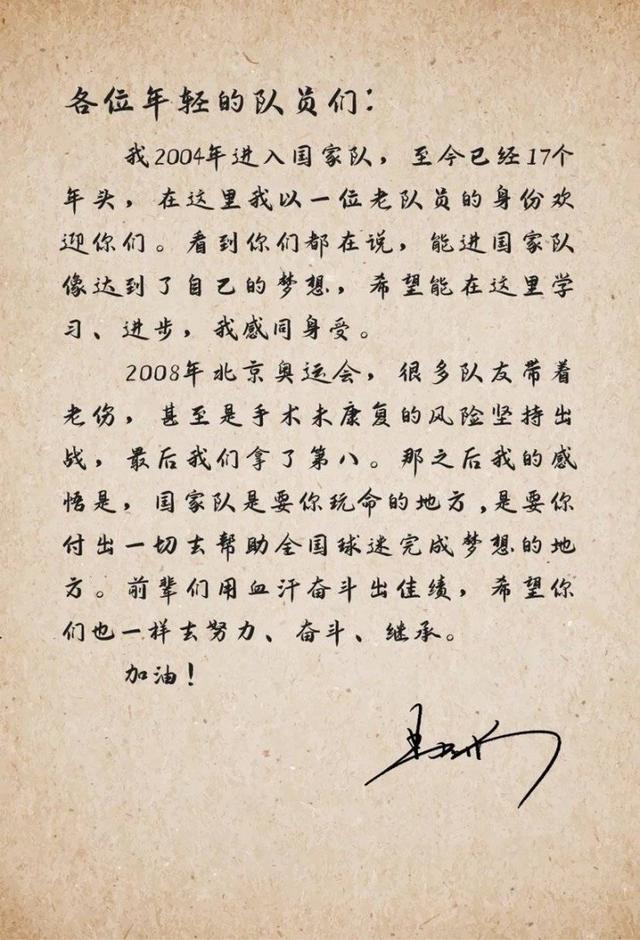 易建聯(lián)在信中回顧了自己首次入選國家隊的感受,表示自己完全能理解新隊員此刻的心情,他尤其強調(diào)了榮譽感與責(zé)任感,對這些小兄弟們說“國家隊是要你玩命的地方”,“各位年輕隊員們,我2004年進入國家隊,至今已經(jīng)有17個年頭,在這里我以一位老隊員的身份歡迎你們??吹侥銈兌荚谡f,能進國家隊像達到了自己的夢想,希望能在這里學(xué)習(xí)、進步,我感同身受。2008年北京奧運會,很多隊友帶著老傷,甚至是手術(shù)未康復(fù)的風(fēng)險堅持出戰(zhàn),最后我們拿到了第八。那之后我的感悟是,國家隊是要你玩命的地方,是要你付出一切去幫助全國球迷完成夢想的地方。前輩們用血汗奮斗出佳績,希望你們也一樣去努力、奮斗、繼承?!?/span>