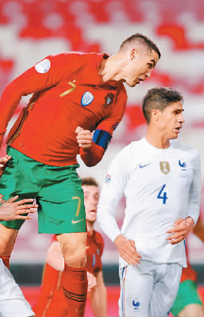 C羅(左)在比賽中攻門。