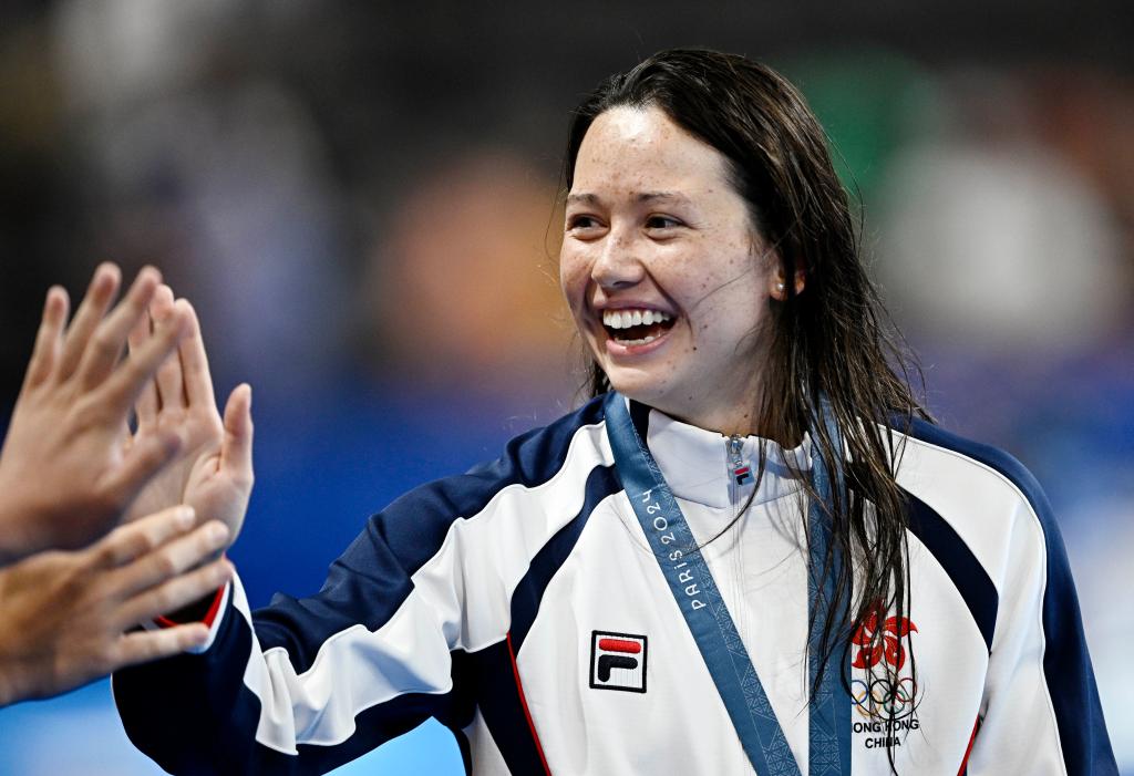 7月29日,季軍中國香港選手何詩蓓在頒獎儀式后。當(dāng)日,巴黎奧運(yùn)會游泳女子200米自由泳決賽在拉德芳斯體育館舉行。新華社記者 王鵬 攝