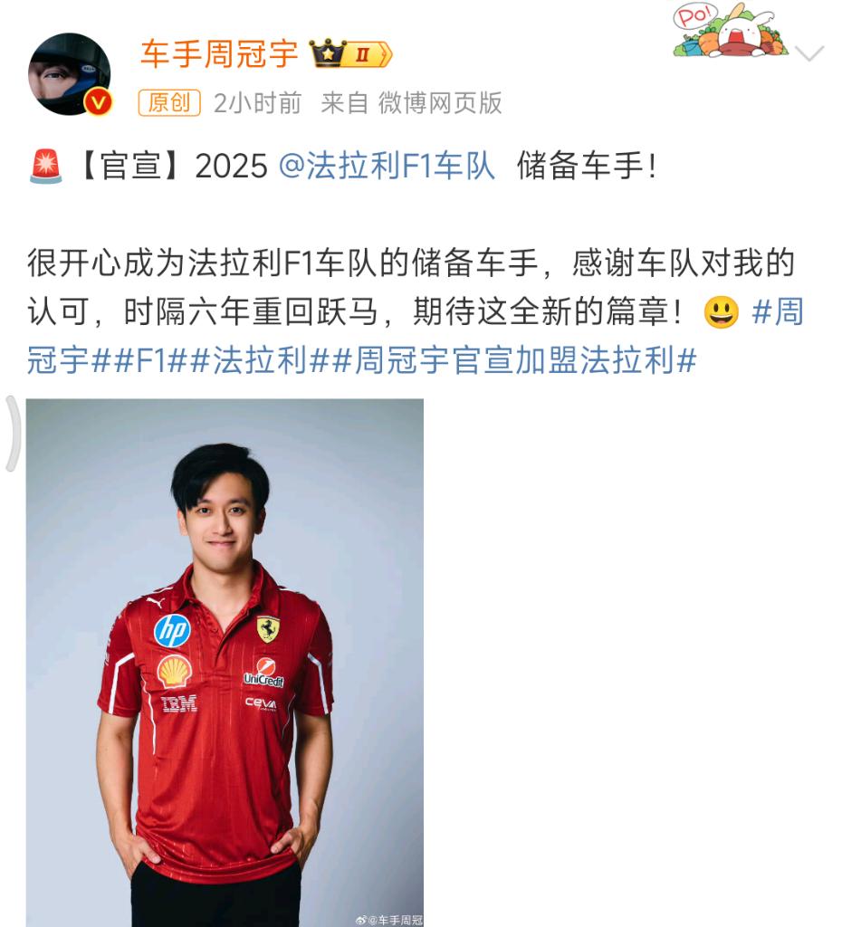 周冠宇通過個人社交平臺表示:“很開心成為法拉利F1車隊的儲備車手,感謝車隊對我的認可,時隔六年重回‘躍馬’,期待這全新的篇章!”2015年至2018年間,周冠宇曾在法拉利青訓(xùn)學院度過四年時光。