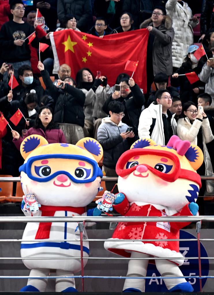 2月12日,吉祥物“濱濱”“妮妮”在比賽間隙打著燈籠,與現(xiàn)場(chǎng)觀眾慶祝元宵節(jié)。新華社記者 李嘉南 攝