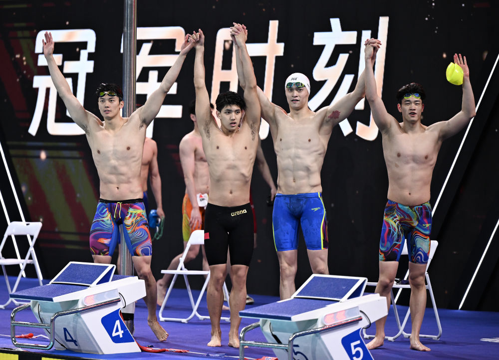 男子4X200米自由泳接力決賽,由汪順、費(fèi)立緯、孫楊和潘展樂組成的浙江隊(duì)以7分12秒76的成績(jī)奪冠。第一棒汪順為浙江隊(duì)建立優(yōu)勢(shì),交接時(shí)已超出第二名一個(gè)身位,此后費(fèi)立緯繼續(xù)擴(kuò)大領(lǐng)先,孫楊和潘展樂沒有給對(duì)手追趕的機(jī)會(huì),浙江隊(duì)以領(lǐng)先第二名超過3秒的優(yōu)勢(shì)奪冠。山東隊(duì)和公安體育協(xié)會(huì)隊(duì)分列二、三位。