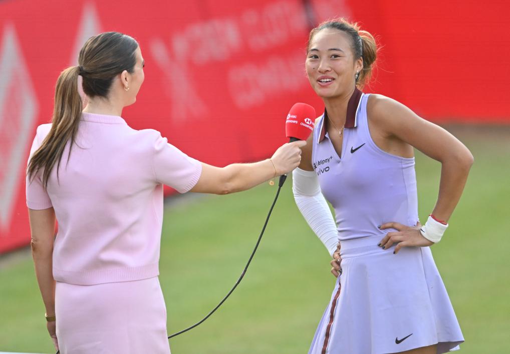 6月12日,鄭欽文(右)在比賽后接受采訪。新華社發(fā)(劉穎 攝)