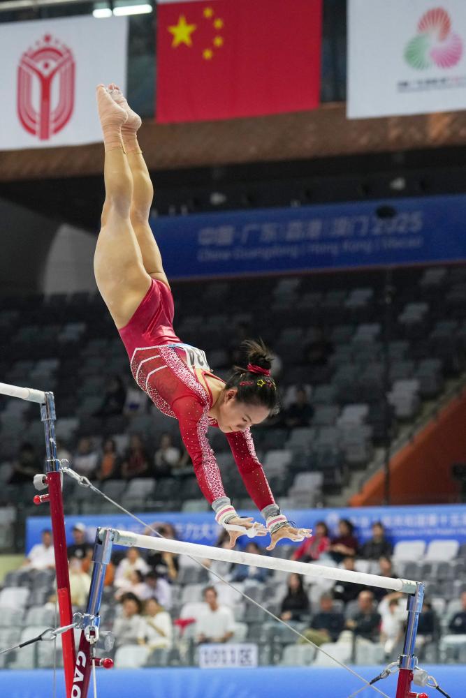 11月13日,浙江隊(duì)選手張清穎在高低杠比賽中。新華社記者 胥冰潔 攝
