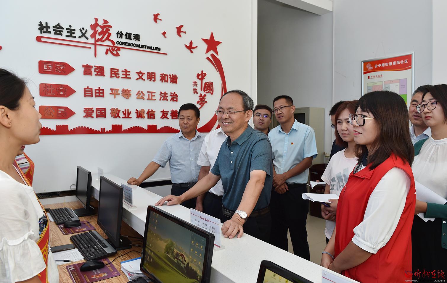 惠民社區(qū)創(chuàng)文氣氛濃厚,墻上張貼著創(chuàng)文展板,隨處可見(jiàn)溫馨的提示,志愿者隨時(shí)提供服務(wù)。鄭連生檢查了社區(qū)綜合文化服務(wù)中心,向工作人員詢(xún)問(wèn)服務(wù)中心的功能和作用,并查看了社區(qū)創(chuàng)文資料。他強(qiáng)調(diào),要切實(shí)發(fā)揮好綜合文化服務(wù)中心在文化宣傳、黨員教育、科普教育、普法教育、市民教育、家長(zhǎng)學(xué)校、道德講堂等方面的作用,形成制度,制定活動(dòng)計(jì)劃,按期開(kāi)展活動(dòng),促進(jìn)群眾素能的不斷提升。
