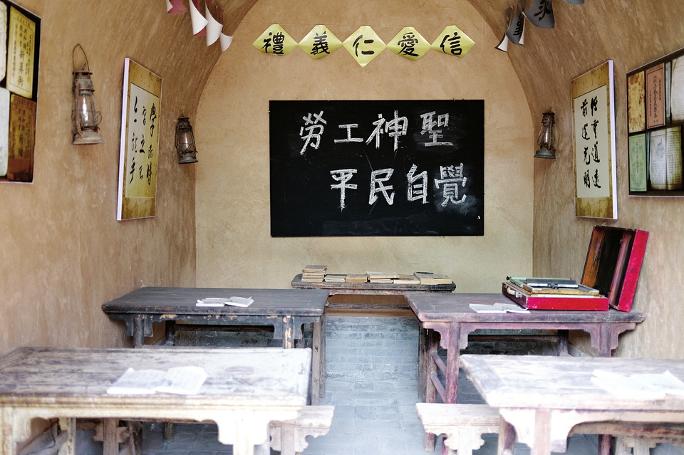 推開堆云洞一層側(cè)院展廳木門,明媚的陽光照進教室,黑板上“勞工神圣平民自覺”8個粉筆字赫然在目,老舊的桌椅、殘留的坑道、銹跡斑斑的馬燈,雖已被時間抹去了原有的模樣,但仍時刻警醒著后人勿忘國恥。