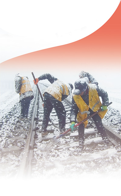 中國鐵路青藏集團公司職工冒雪對整修后的道床進行清理。馬祎俊攝