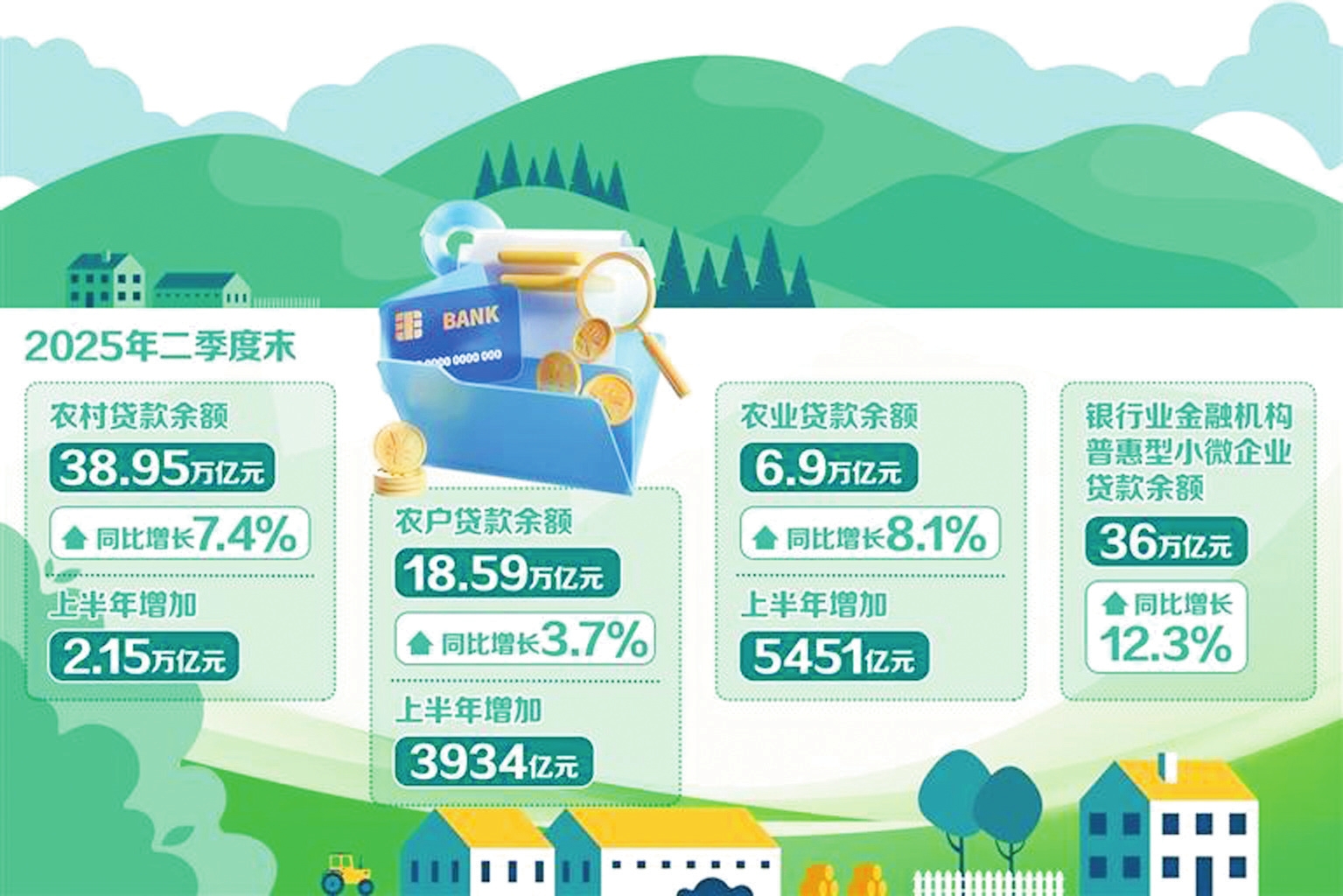 總的來看,今年二季度涉農(nóng)金融投放增量擴(kuò)面。2025年二季度金融機(jī)構(gòu)貸款投向統(tǒng)計報告顯示,2025年二季度末,農(nóng)村貸款余額38.95萬億元,同比增長7.4%,上半年增加2.15萬億元。農(nóng)戶貸款余額18.59萬億元,同比增長3.7%,上半年增加3934億元。農(nóng)業(yè)貸款余額6.9萬億元,同比增長8.1%,上半年增加5451億元。