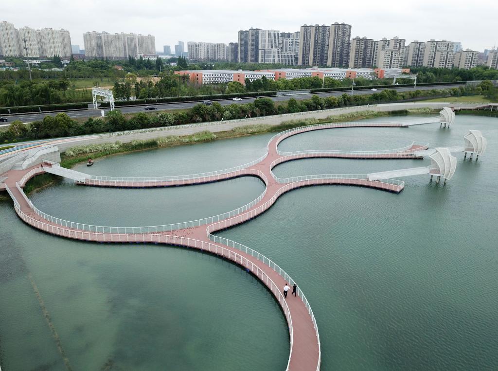 5月17日,市民在小溪港漁咀公園散步休閑(無(wú)人機(jī)照片)。新華社記者馬寧 攝