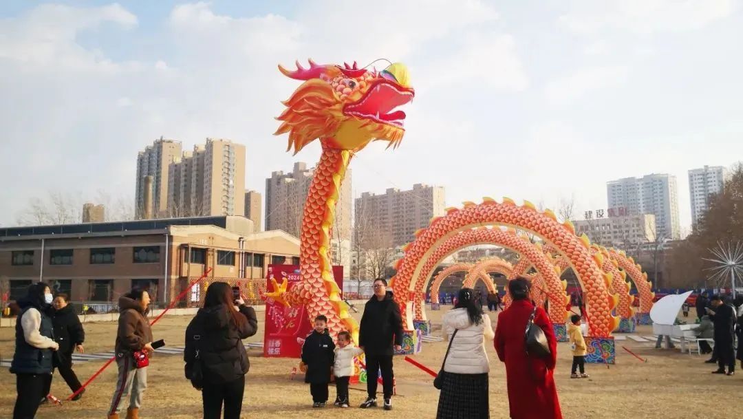 在大同市平城區(qū)華嚴寺廣場,人們在超大龍型彩燈前打卡留念