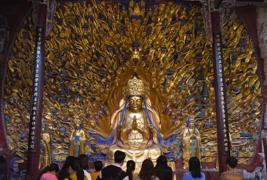 1952年,大足石刻文物保護機構(gòu)成立,開始系統(tǒng)科學保護大足石刻。當年,北山石刻保護長廊啟動建設,北山石刻上方加蓋了擋雨的頂棚;1961年,北山、寶頂山摩崖造像成為第一批全國重點文物保護單位;1999年,大足石刻被列入《世界遺產(chǎn)名錄》;2015年,全國石質(zhì)文物保護一號工程——大足石刻千手觀音造像搶救性保護工程竣工;2019年,《大足石刻全集》出版,填補了國內(nèi)石窟寺編寫出版大型考古報告的空白……