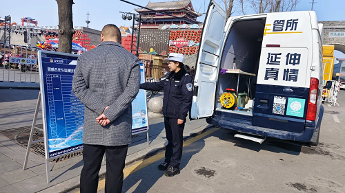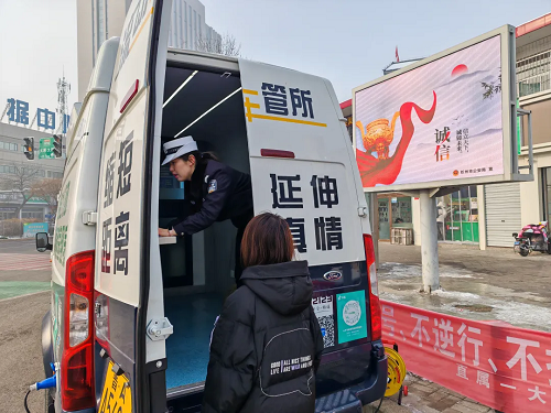 春節(jié)假期,城市、鄉(xiāng)村到處都彌漫著歡樂(lè)祥和的氣氛,初一至初七,在山西省忻州市忻府區(qū)光明西街古城北廣場(chǎng)、公園西街世紀(jì)花苑小區(qū)南門(mén)等人流量大、人員集中場(chǎng)所,忻州市公安局交警支隊(duì)的警郵車(chē)管便民服務(wù)車(chē)格外顯眼?!翱s短距離、延伸真情”,這輛承載著為駕駛?cè)颂峁崆橹艿椒?wù)、為車(chē)輛安全出行提供保障,被群眾稱(chēng)為“流動(dòng)車(chē)管所”的車(chē)管便民服務(wù)車(chē)讓寒冬暖流涌動(dòng)。