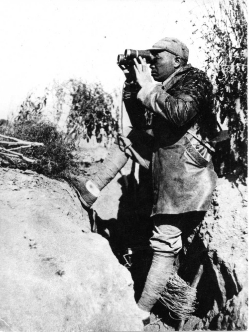 “誰敢橫刀立馬,唯我彭大將軍?!闭掌校淼聭汛蟀雮€身體露在戰(zhàn)壕外,左腳踏在戰(zhàn)壕底,右腳蹬著戰(zhàn)壕前沿,坐靠在戰(zhàn)壕后沿上,手持望遠鏡,神情專注地觀察戰(zhàn)況。