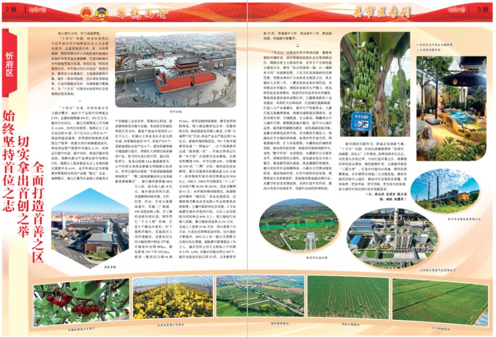 “十四五”以來(lái),忻府區(qū)綜合實(shí)力穩(wěn)步攀升,地區(qū)生產(chǎn)總值年均增速達(dá)5.3%,總量相繼跨越200億、250億大關(guān),穩(wěn)居全市首位;一般公共預(yù)算收入年均增長(zhǎng)4.16%,位列全市前茅;規(guī)模以上工業(yè)企業(yè)達(dá)到53家,開(kāi)工億元以上項(xiàng)目46個(gè),清涼灣溫泉康養(yǎng)、宏厚鋼結(jié)構(gòu)裝配式建筑生產(chǎn)線等一批重大項(xiàng)目相繼建成投用,帶動(dòng)固定資產(chǎn)投資年均增長(zhǎng)6.1%,經(jīng)濟(jì)運(yùn)行穩(wěn)中有進(jìn)、穩(wěn)中向好。轉(zhuǎn)型升級(jí)步伐加快,戰(zhàn)略性新興產(chǎn)業(yè)增加值年均增長(zhǎng)12%,規(guī)模以上裝備制造業(yè)占工業(yè)增加值比重提升至6.6%,金宇科林認(rèn)定為省級(jí)廢棄資源綜合利用產(chǎn)業(yè)鏈“鏈主”企業(yè),晨輝鍛壓、泰山石膏等企業(yè)納入省級(jí)重點(diǎn)產(chǎn)業(yè)鏈鏈上企業(yè)名單,資源再生利用、溫泉康養(yǎng)獲批市級(jí)專(zhuān)業(yè)鎮(zhèn);農(nóng)業(yè)綜合機(jī)械化率提升至85%,糧食產(chǎn)量連年保持在6.1億斤以上,區(qū)級(jí)以上農(nóng)業(yè)龍頭企業(yè)達(dá)到32家,培育綠色食品35個(gè)、有機(jī)產(chǎn)品9個(gè)、國(guó)家地理標(biāo)志農(nóng)產(chǎn)品4個(gè);成功創(chuàng)建省級(jí)全域旅游示范區(qū),持續(xù)壯大奇頓合溫泉康養(yǎng)產(chǎn)業(yè),牧馬河生態(tài)公園開(kāi)園,遺山園、陀羅山、蒼龍山創(chuàng)建AAA級(jí)旅游景區(qū),云中河景區(qū)榮獲國(guó)家級(jí)文明旅游示范單位,忻州古城先后獲批“首批國(guó)家級(jí)旅游休閑街區(qū)”“第二批國(guó)家級(jí)夜間文化和旅游消費(fèi)集聚區(qū)”,累計(jì)接待游客超6800萬(wàn)人次,綜合收入逾18億元。城鄉(xiāng)建設(shè)協(xié)同共進(jìn),交通路網(wǎng)持續(xù)完善,太忻、忻原、忻定、忻奇大道建成通車(chē),實(shí)施二廣高速、108國(guó)道改線工程,開(kāi)工雄忻高鐵忻府區(qū)段;深學(xué)篤行“千萬(wàn)工程”經(jīng)驗(yàn),打造8個(gè)精品示范村、50個(gè)提檔升級(jí)村;實(shí)施農(nóng)村人居環(huán)境整治,完善農(nóng)村生活垃圾處理中轉(zhuǎn)站157座,升級(jí)農(nóng)村電網(wǎng)980km,硬化街巷124個(gè)村453.6km,建設(shè)一般農(nóng)村公路46條93.6km。改革動(dòng)能持續(xù)增強(qiáng),教育改革持續(xù)深化,深入推進(jìn)集團(tuán)化辦學(xué)、實(shí)施校校合作;林權(quán)制度改革深入推進(jìn),開(kāi)展“百場(chǎng)帶千村”行動(dòng),林業(yè)產(chǎn)業(yè)總產(chǎn)值達(dá)到7.56億元;營(yíng)商環(huán)境持續(xù)優(yōu)化,991個(gè)依申請(qǐng)事項(xiàng)實(shí)現(xiàn)“一網(wǎng)通辦”,15個(gè)高頻事項(xiàng)達(dá)成“最多跑一次”;市場(chǎng)主體登記注冊(cè)“半日結(jié)”辦理模式全面落地,實(shí)現(xiàn)材料精簡(jiǎn)30%、環(huán)節(jié)壓縮60%、時(shí)限縮短50%的“三降”目標(biāo)。綠色底色更加鮮明,累計(jì)實(shí)施清潔取暖改造2.46萬(wàn)余戶,農(nóng)作物秸稈綜合利用率穩(wěn)定在90%以上,PM2.5、PM10年均濃度比“十三五”末分別下降29.5%和24.6%,優(yōu)良天數(shù)增加41天;水環(huán)境治理持續(xù)深化,縱深推進(jìn)河湖庫(kù)“清四亂”常態(tài)化規(guī)范化,定襄橋國(guó)考斷面水質(zhì)連續(xù)4年達(dá)到Ⅲ類(lèi)水體標(biāo)準(zhǔn);土壤污染防治扎實(shí)有效,2萬(wàn)畝地膜實(shí)現(xiàn)科學(xué)使用回收,大宗工業(yè)固廢綜合利用率達(dá)80%以上;國(guó)土綠化行動(dòng)深入實(shí)施,累計(jì)建設(shè)營(yíng)造林21.04萬(wàn)畝,完成人工造林10.46萬(wàn)畝、封山育林7.53萬(wàn)畝,生態(tài)安全屏障更加牢固。民生福祉不斷提升,88%以上的一般公共預(yù)算支出投向民生領(lǐng)域,城鎮(zhèn)累計(jì)新增就業(yè)1.76萬(wàn)人,城鄉(xiāng)居民人均可支配收入年均增長(zhǎng)5.3%、6.8%;實(shí)施鄉(xiāng)村振興項(xiàng)目305個(gè),提升改造農(nóng)村幼兒園25所、義務(wù)教育學(xué)校55所、普通高中3所、職業(yè)高中1所,群眾獲得感、幸福感不斷攀升。